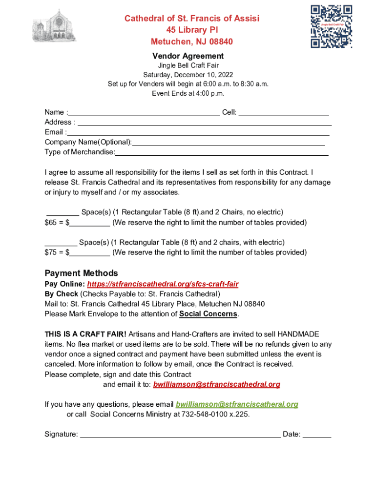 Cathedral of St. Francis of Assisi 45 Library Pl Matches, NJ 08840 Vendor Agreement Jingle Bell Craft Fair Saturday, December 10, 2022, Set up for Vendors will begin at 6:00 a.m. to 8:30 a.m. Event