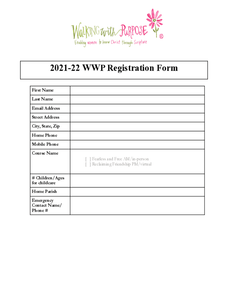 202122 WWF Registration Form First Name Last Name Email Address Street Address City, State, Zip Home Phone Mobile Phone Course Name [ ] Fearless and Free AM/unperson [ ] Reclaiming Friendship PM/virtual