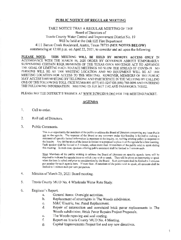 12MINUTES OF REGULAR MEETING OF BOARD OF DIRECTORS OF TRAVIS COUNTY ACID NO. 19 March 25, 2021, STATE OF TEXAS COUNTY OF TRAVIS A regular meeting of the Board of Directors of Travis County ACID No.