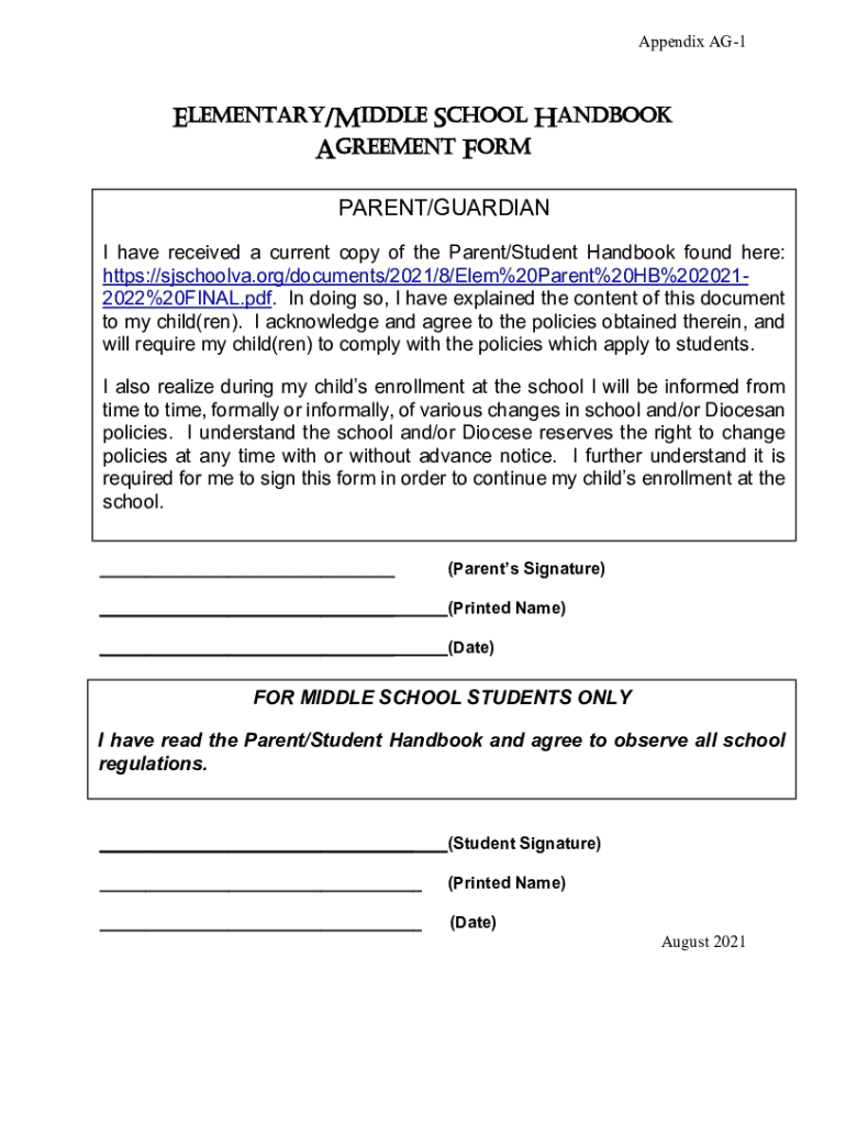 Appendix AG1ELEMENTARY/MIDDLE SCHOOL HANDBOOK AGREEMENT FORM PARENT/GUARDIAN I have received a current copy of the Parent/Student Handbook found here: https://sjschoolva.org/documents/2021/8/Elem%20Parent%20HB%2020212022%20FINAL.pdf.