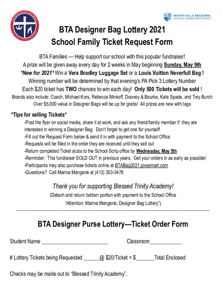 BTA Designer Bag Lottery 2021 School Family Ticket Request Form BTA Families Help support our school with this popular fundraiser! A prize will be given away every day for 2 weeks in May beginning