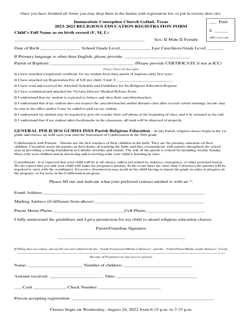 Once you have finished all forms you may drop them in the basket with registration fee, or put in rectory door slot. Immaculate Conception Church Gold, Texas 20232023 RELIGIOUS EDUCATION REGISTRATION