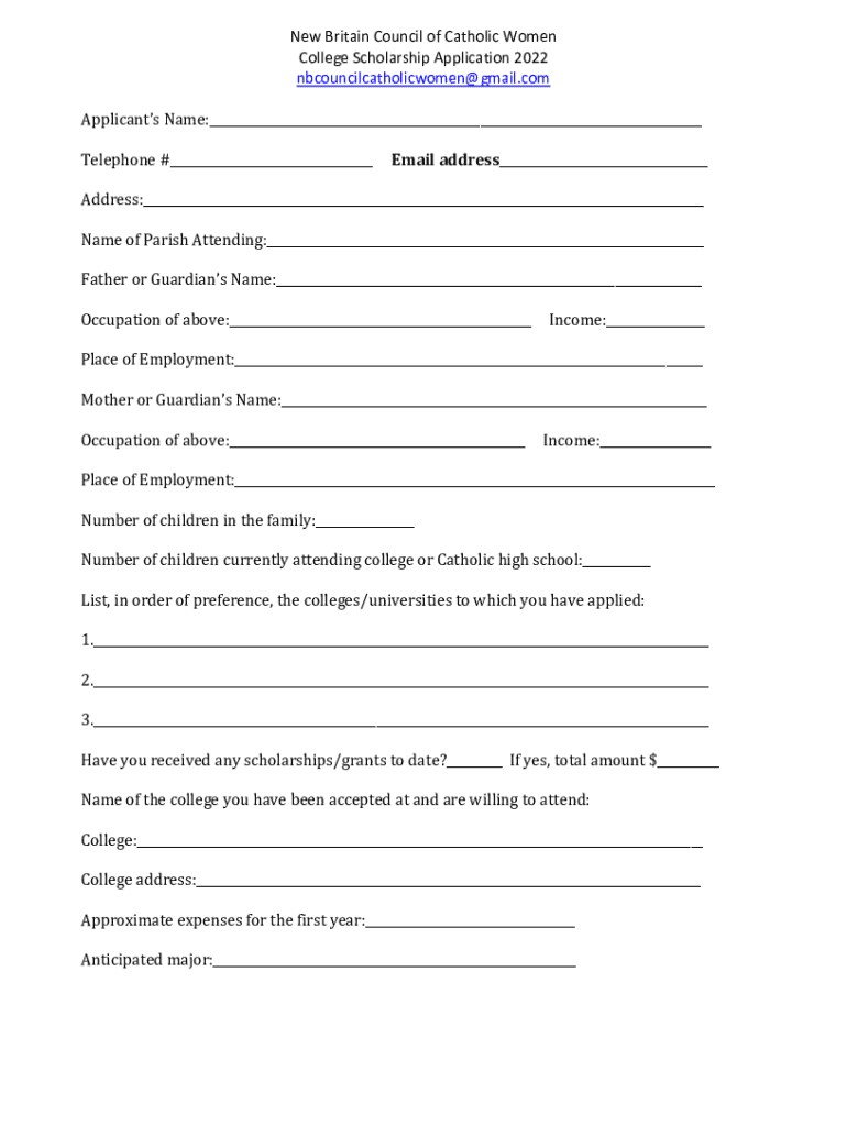 New Britain Council of Catholic Women College Scholarship Application 2022 nbcouncilcatholicwomen@gmail.com Applicants Name:___ Telephone #___Email address___Address:___ Name of Parish Attending:___