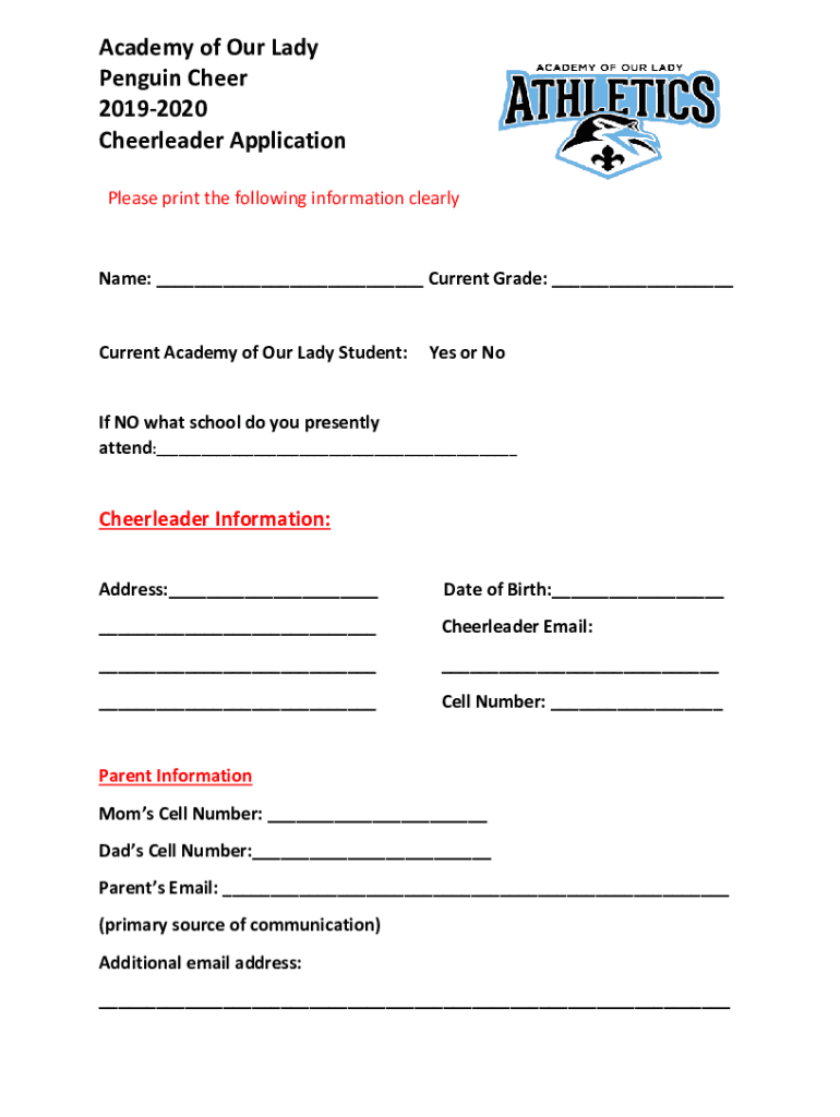 Academy of Our Lady Penguin Cheer 20192020 Cheerleader Application Please print the following information clearlyName: ___ Current Grade: ___Current Academy of Our Lady Student:Yes or Coif NO what