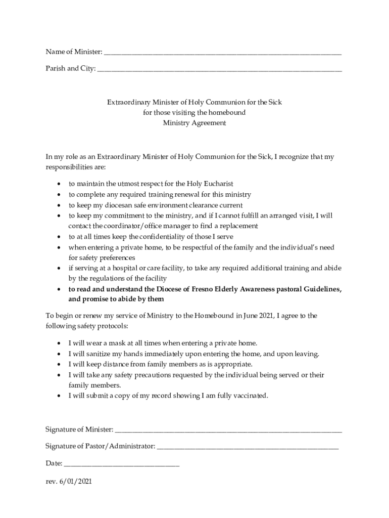 Name of Minister: ___ Parish and City: ___Extraordinary Minister of Holy Communion for the Sick for those visiting the home bound Ministry Agreement In my role as an Extraordinary Minister of Holy