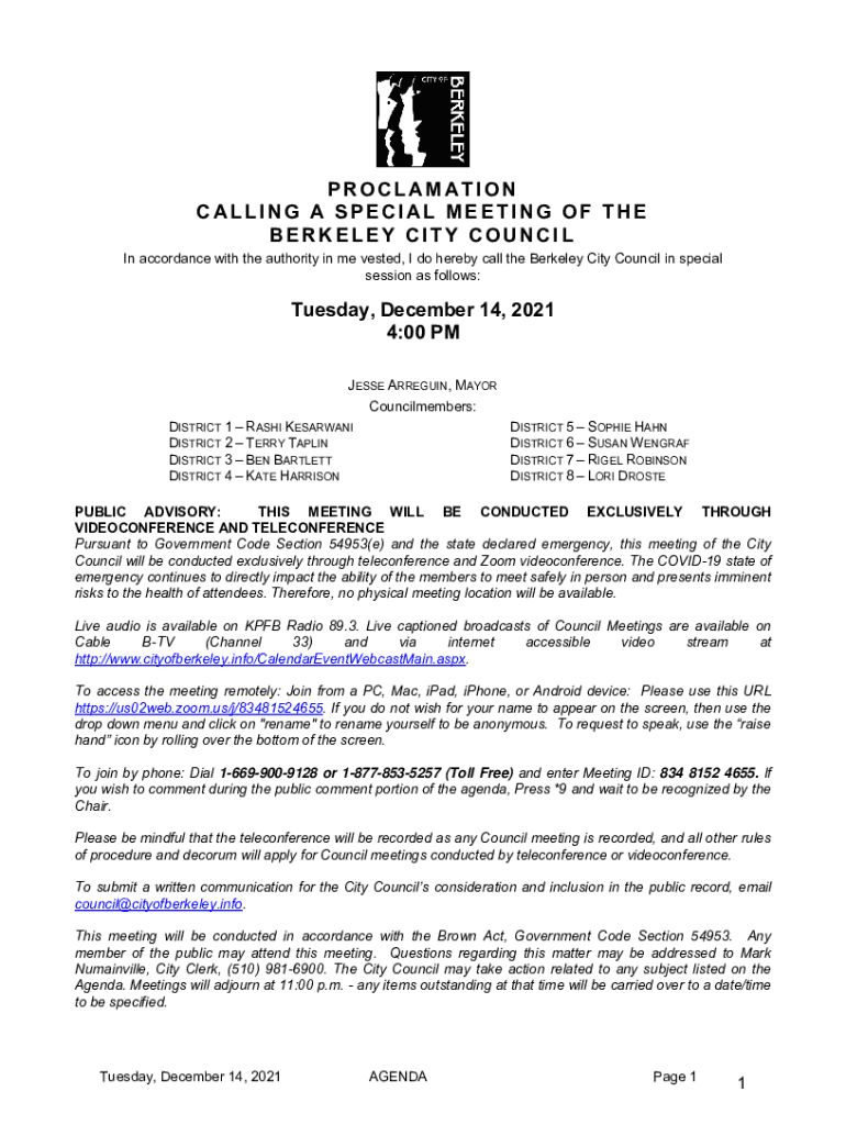 PROCLAMATION CALLING A SPECIAL MEETING OF THE BERKELEY CITY COUNCIL In accordance with the authority in me vested, I do hereby call the Berkeley City Council in special session as follows:Tuesday,