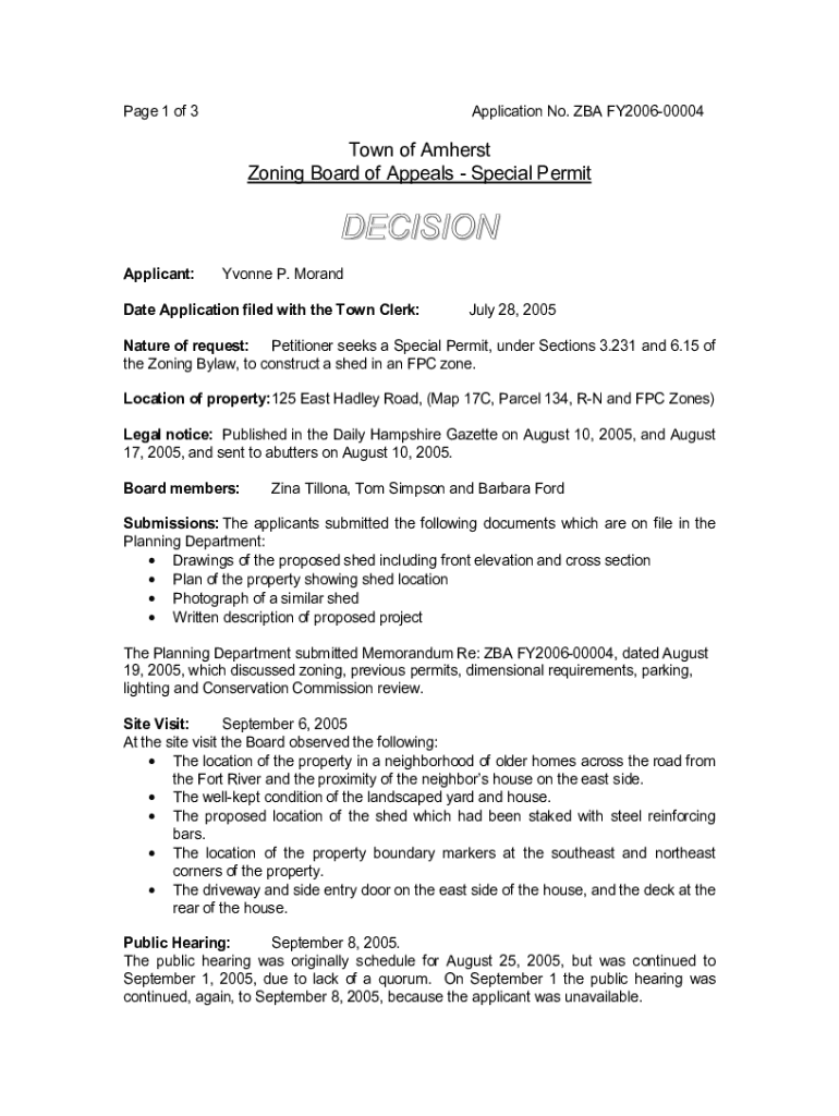 Page 1 of 3Application No. CBA FY200600004Town of Amherst Zoning Board of Appeals Special PermitDECISION Applicant:Yvonne P. Mandate Application filed with the Town Clerk:July 28, 2005Nature of request: