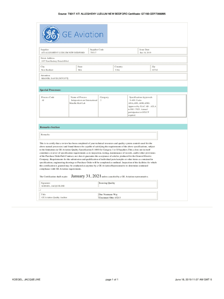 Source: T9317 ATI ALLEGHENY LULU NEW BEDFORD Certificate: GT193CERT006895SupplierSupplier Reissue Date ATI ALLEGHENY LULU NEW BEDFORDT9317Jun 18, 2019Street Address 1357 East Rodney French BlvdCityStateCountryZipNew
