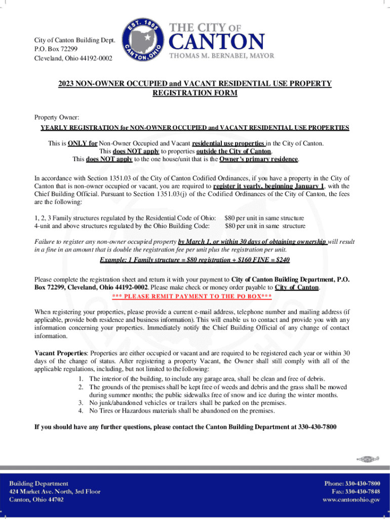 City of Canton Building Dept. P.O. Box 72299 Cleveland, Ohio 4419200022023 OWNER OCCUPIED and VACANT RESIDENTIAL USE PROPERTY REGISTRATION FORM Property Owner: YEARLY REGISTRATION for OWNER OCCUPIED