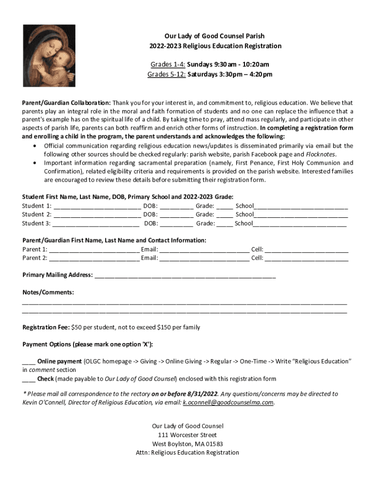 Our Lady of Good Counsel Parish 20222023 Religious Education Registration Grades 14: Sundays 9:30am 10:20am Grades 512: Saturdays 3:30pm 4:20pmParent/Guardian Collaboration: Thank you for your interest