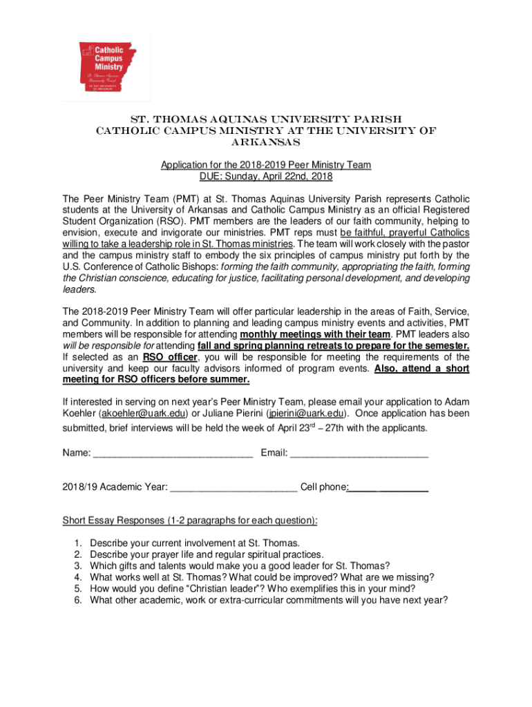 St. Thomas Aquinas university parish Catholic Campus Ministry at the University of Arkansas Application for the 20182019 Peer Ministry Team DUE: Sunday, April 22nd, 2018 The Peer Ministry Team (PMT)