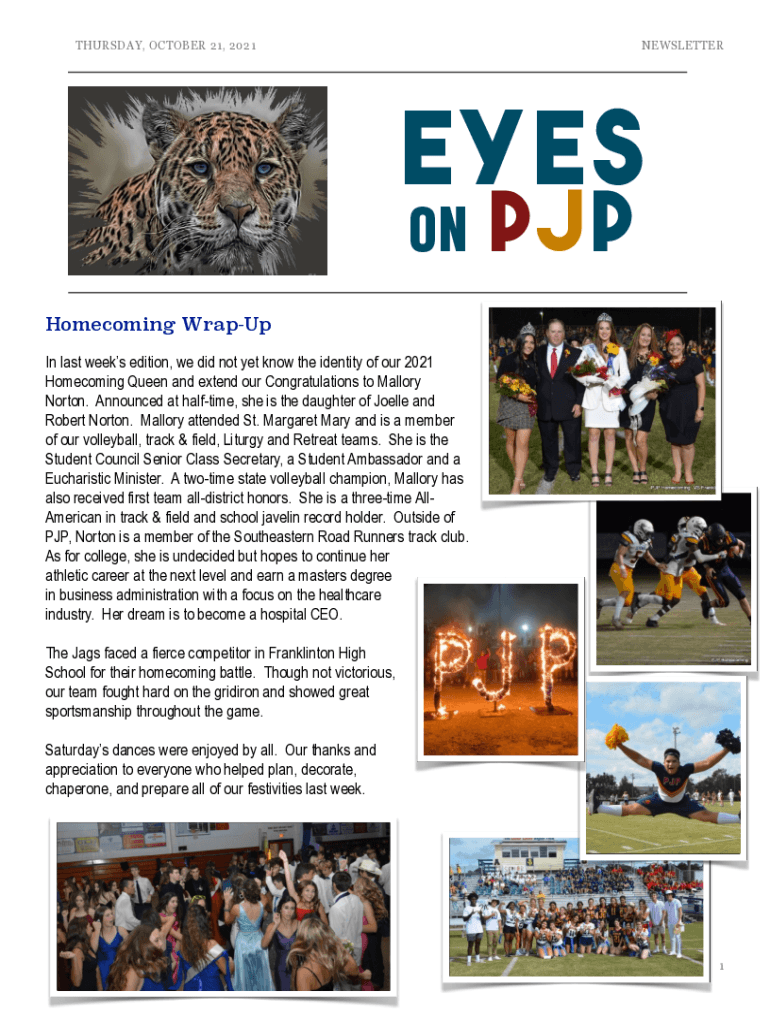THURSDAY, OCTOBER 21, 2021NEWSLETTEREYES ONPJPHomecoming Wrap In last weeks' edition, we did not yet know the identity of our 2021 Homecoming Queen and extend our Congratulations to Mallory Norton.