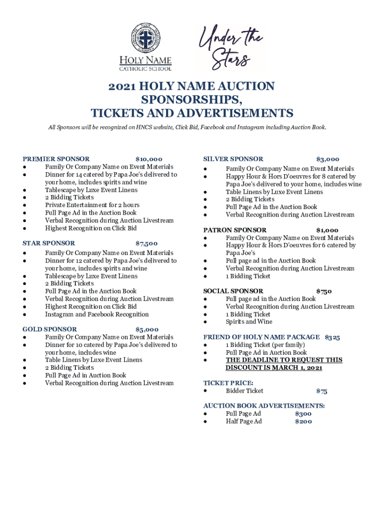 2021 HOLY NAME AUCTION SPONSORSHIPS, TICKETS AND ADVERTISEMENTS All Sponsors will be recognized on HCS website, Click Bid, Facebook and Instagram including Auction Book. PREMIER SPONSOR $10,000 Family