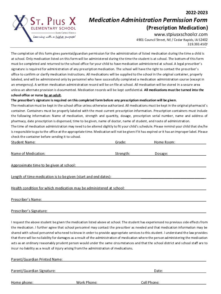 20222023Medication Administration Permission Form (Prescription Medication) www.stpiusxschoolcr.com 4901 Council Street, NE / Cedar Rapids, IA 52402 319.393.4507 The completion of this form gives