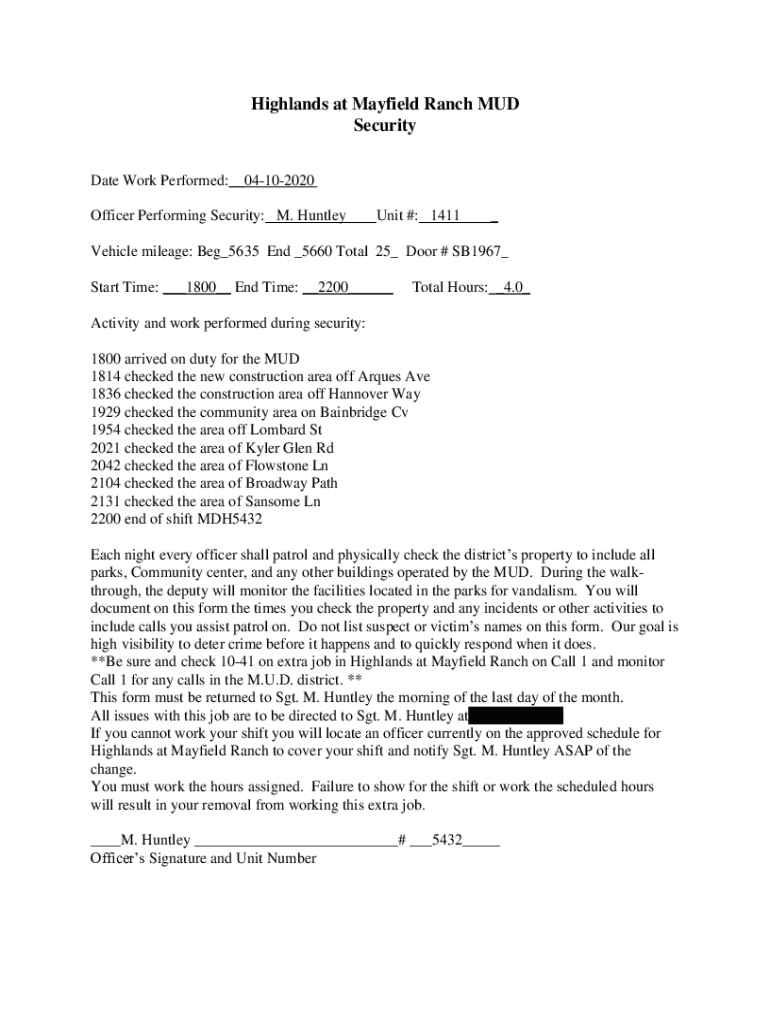 Highlands at Mayfield Ranch MUD Security Date Work Performed:__04102020 Officer Performing Security: M. HuntleyUnit #: 1411_Vehicle mileage: Beg_5635 End _5660 Total 25_ Door # SB1967_ Start Time: