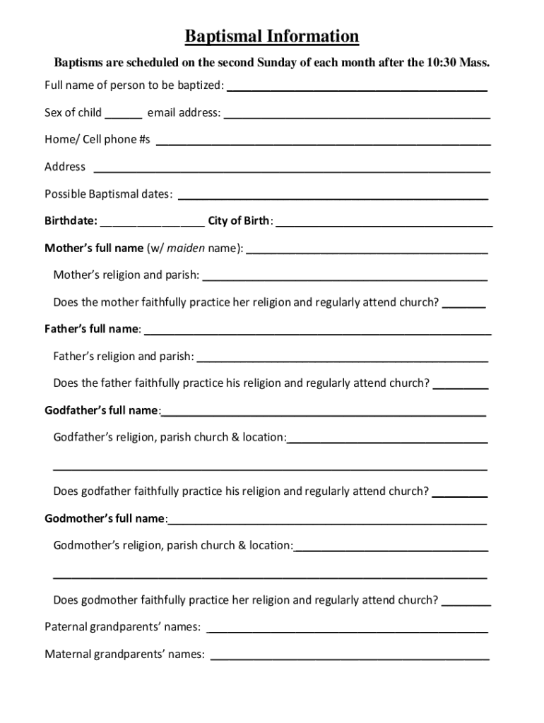 Baptismal Information Baptisms are scheduled on the second Sunday of each month after the 10:30 Mass. Full name of person to be baptized: ___ Sex of child ___ email address: ___ Home/ Cell phone #s