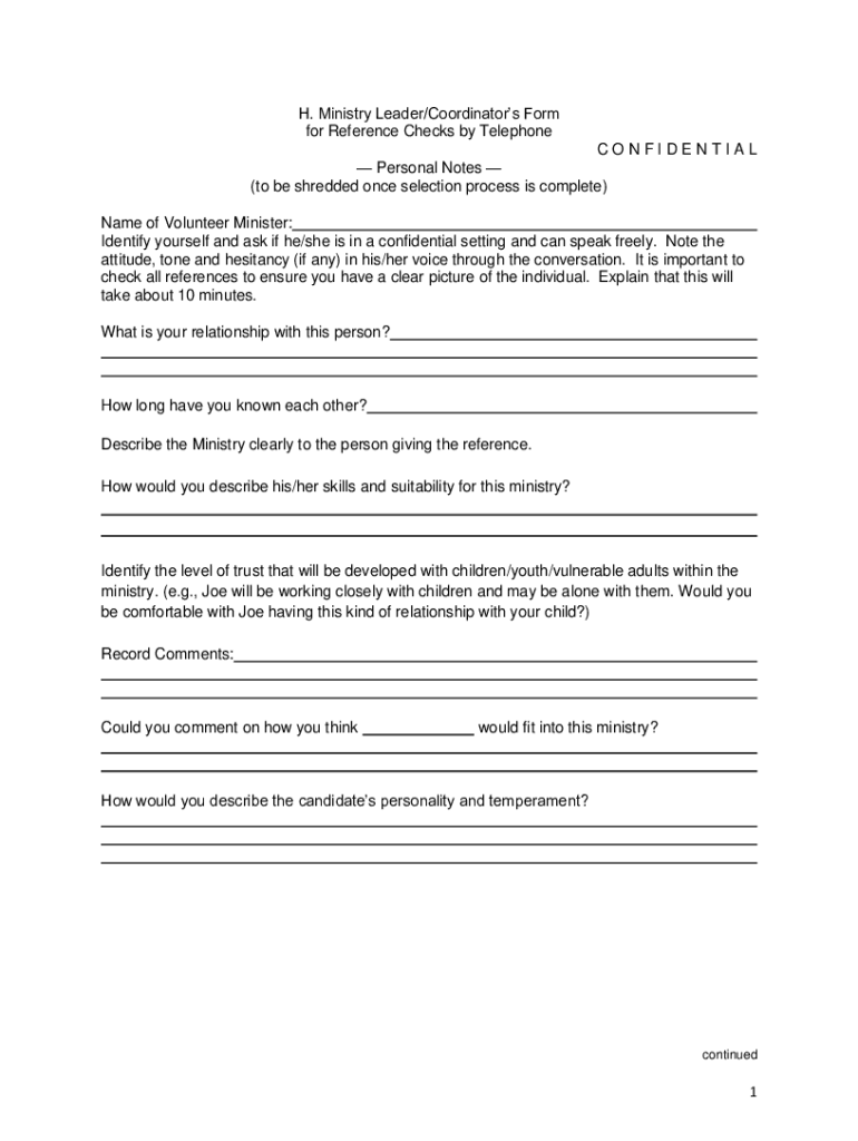 H. Ministry Leader/Coordinators Form for Reference Checks by Telephone CONFIDENTIAL Personal Notes (to be shredded once selection process is complete) Name of Volunteer Minister: Identify yourself