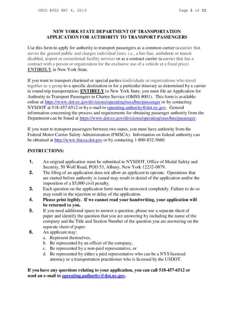OMSK #002 MAY 4, 2016Page 1 of 11NEW YORK STATE DEPARTMENT OF TRANSPORTATION APPLICATION FOR AUTHORITY TO TRANSPORT PASSENGERS Use this form to apply for authority to transport passengers as a common