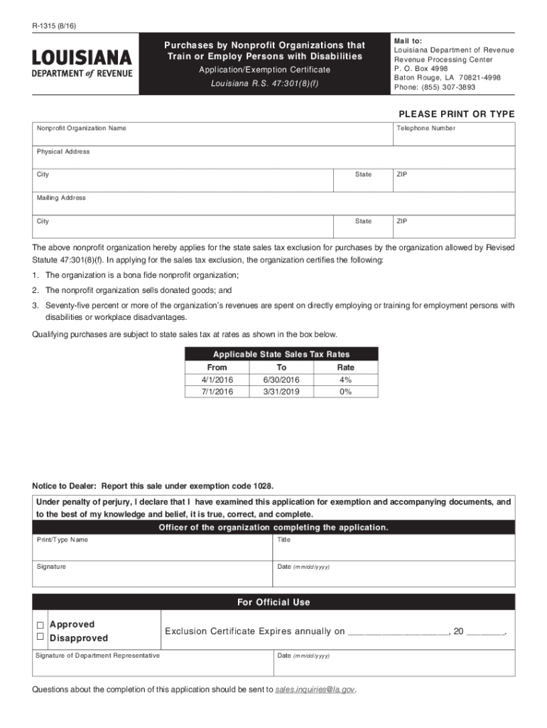 R1315 (8/16)Purchases by Nonprofit Organizations that Train or Employ Persons with Disabilities Application/Exemption Certificate Louisiana R.S. 47:301(8)(f)Mail to: Louisiana Department of Revenue