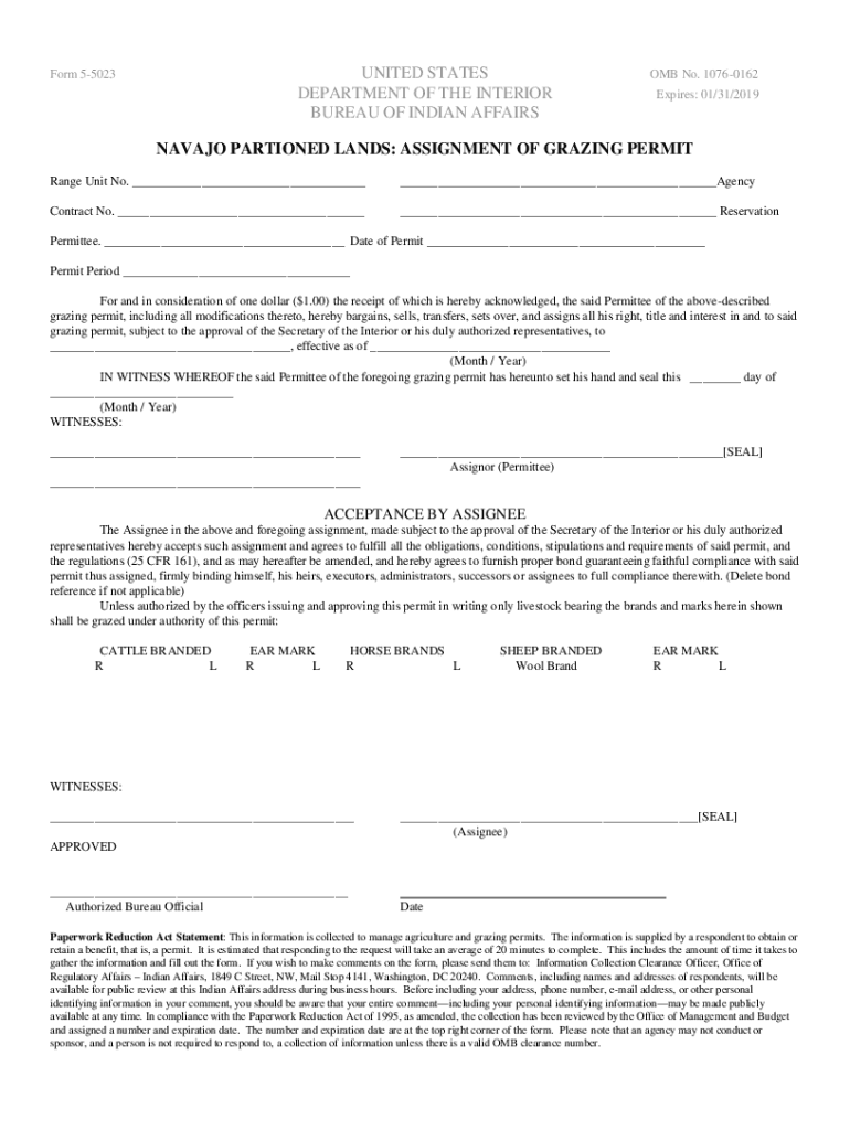 UNITED STATES DEPARTMENT OF THE INTERIOR BUREAU OF INDIAN AFFAIRSForm 55023OMB No. 10760162 Expires: 01/31/2019NAVAJO PORTIONED LANDS: ASSIGNMENT OF GRAZING PERMIT Range Unit No. ______AgencyContract