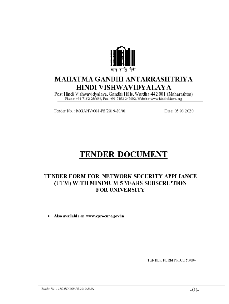 MAHATMA GANDHI ANTARRASHTRIYA HINDI VISHWAVIDYALAYA Post Hindi Vishwavidyalaya, Gandhi Hills, Wardha442 001 (Maharashtra) Phone: +917152255686, Fax: +917152247602, Website: www.hindivishwa.orgTender