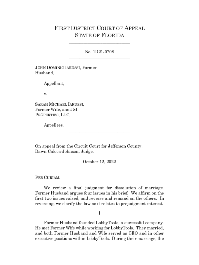 FIRST DISTRICT COURT OF APPEAL STATE OF FLORIDA ___No. 1D210708 ___ JOHN DOMINIC RUSSIA, Former Husband, Appellant, v. SARAH MICHAEL RUSSIA, Former Wife, and CSI PROPERTIES, LLC, Expellees.___On appeal