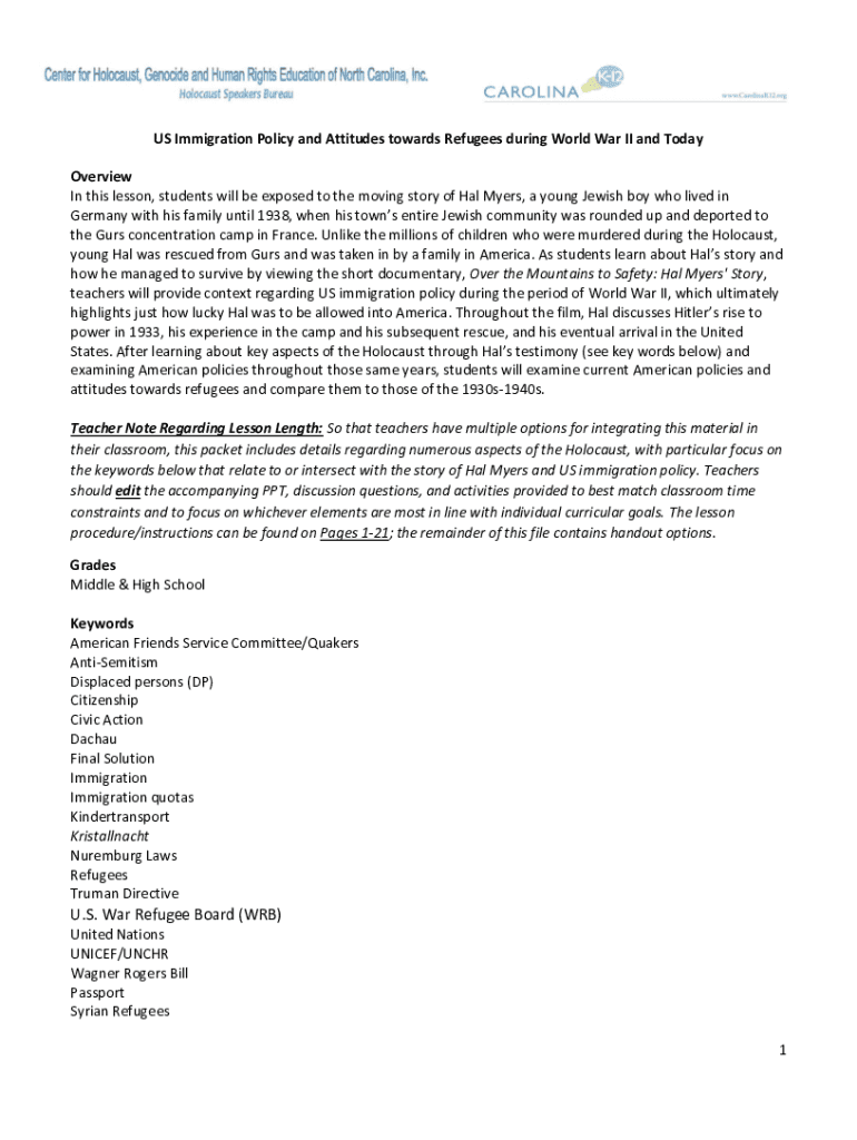 US Immigration Policy and Attitudes towards Refugees during World War II and Today Overview In this lesson, students will be exposed to the moving story of Hal Myers, a young Jewish boy who lived