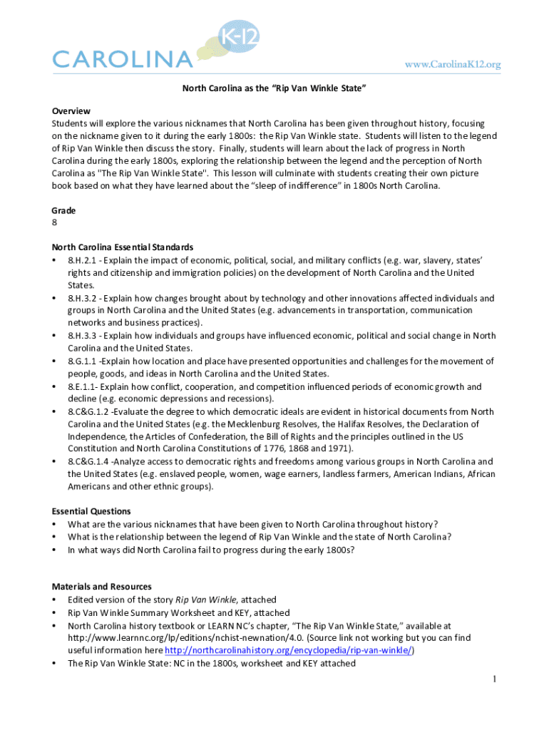 NorthCarolinaastheRipVanWinkleState Overview StudentswillexplorethevariousnicknamesthatNorthCarolinahasbeengiventhroughouthistory, focusing onthenicknamegiventoitduringtheearly1800s:theRipVanWinklestate.