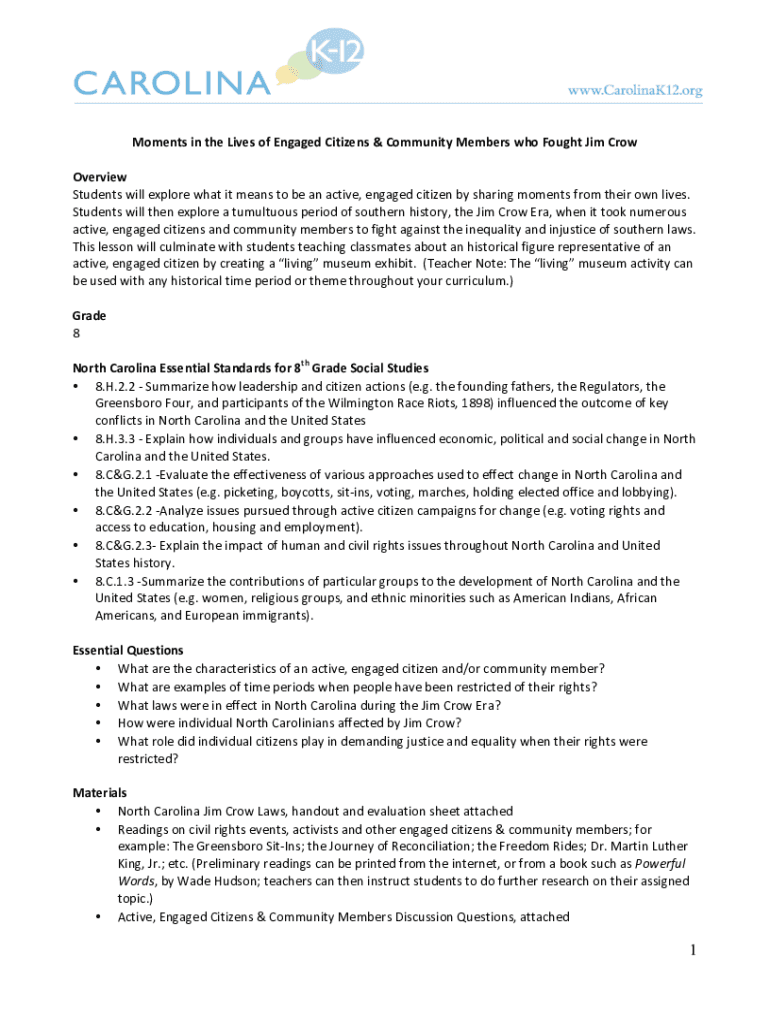MomentsintheLivesofEngagedCitizens&CommunityMemberswhoFoughtJimCrow Overview Studentswillexplorewhatitmeanstobeanactive, engagedcitizenbysharingmomentsfromtheirownlives. Studentswillthenexploreatumultuousperiodofsouthernhistory,