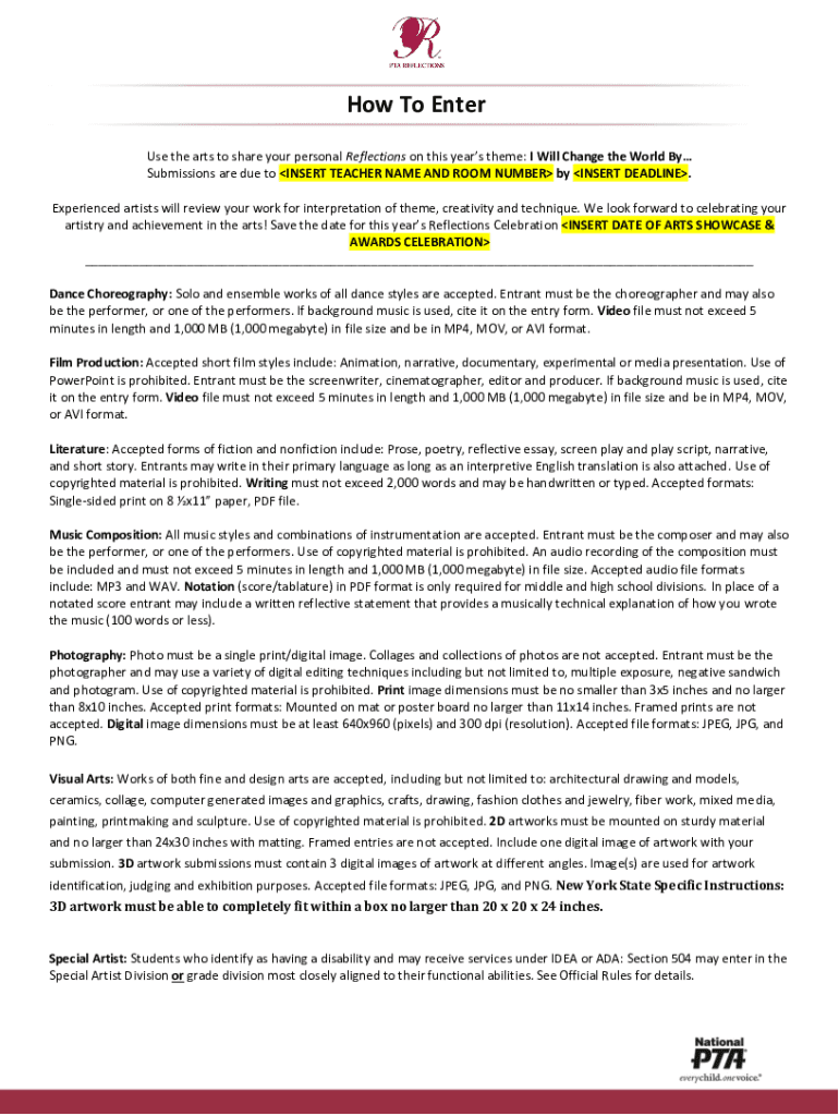 How To Enter Use the arts to share your personal Reflections on this year's theme: I Will Change the World By Submissions are due to INSERT TEACHER NAME AND ROOM NUMBER by INSERT DEADLINE. Experienced