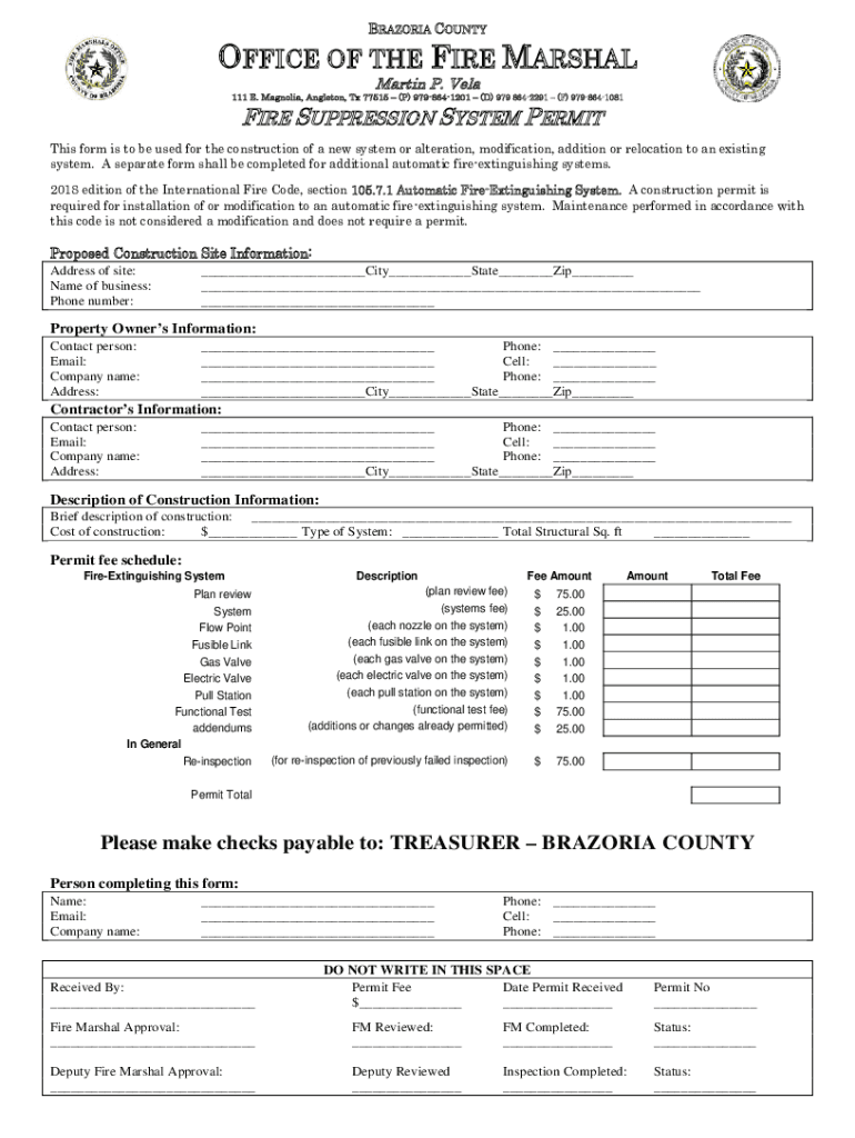 BRAZIL COUNTYOFFICE OF THE FIRE MARSHAL Martin P. Vela111 E. Magnolia, Angleton, TX 77515 (P) 9798641201 (D) 979 8642291 (F) 9798641081FIRE SUPPRESSION SYSTEM Permitted form is to be used for the