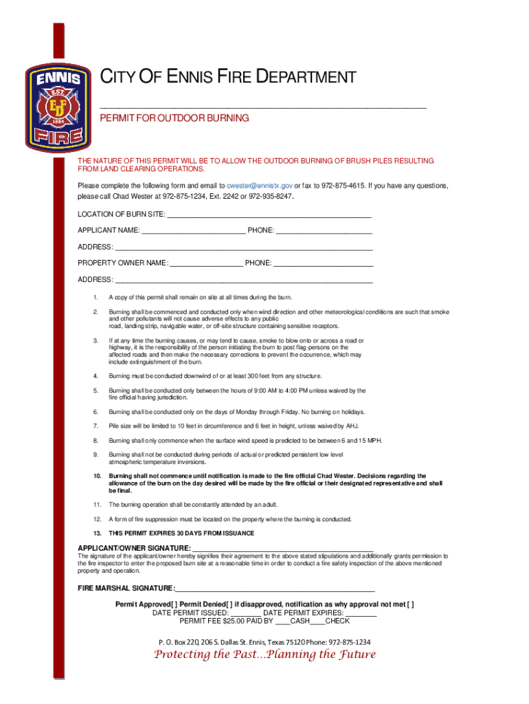CITY OF TENNIS FIRE DEPARTMENT ___ PERMIT FOR OUTDOOR BURNING NATURE OF THIS PERMIT WILL BE TO ALLOW THE OUTDOOR BURNING OF BRUSH PILES RESULTING FROM LAND CLEARING OPERATIONS. Please complete the