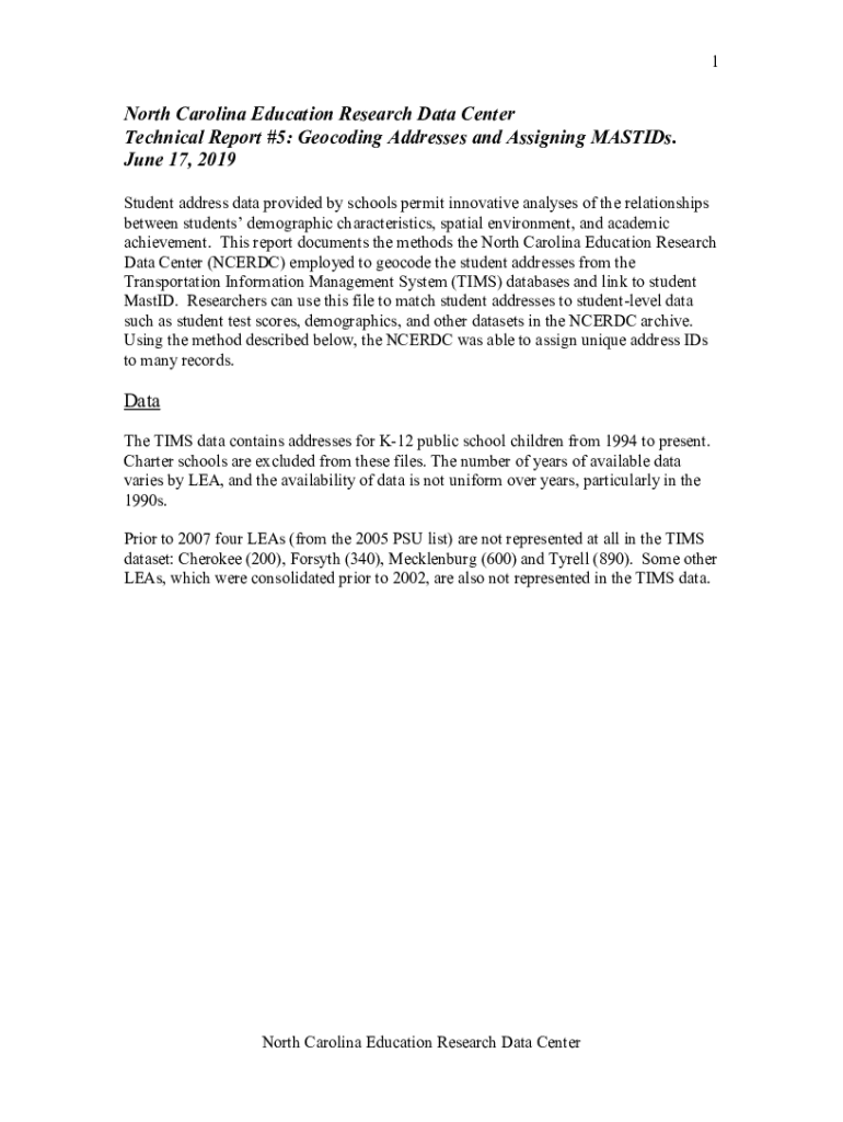 1North Carolina Education Research Data Center Technical Report #5: Geocoding Addresses and Assigning Mastoids. June 17, 2019, Student address data provided by schools permit innovative analyses of