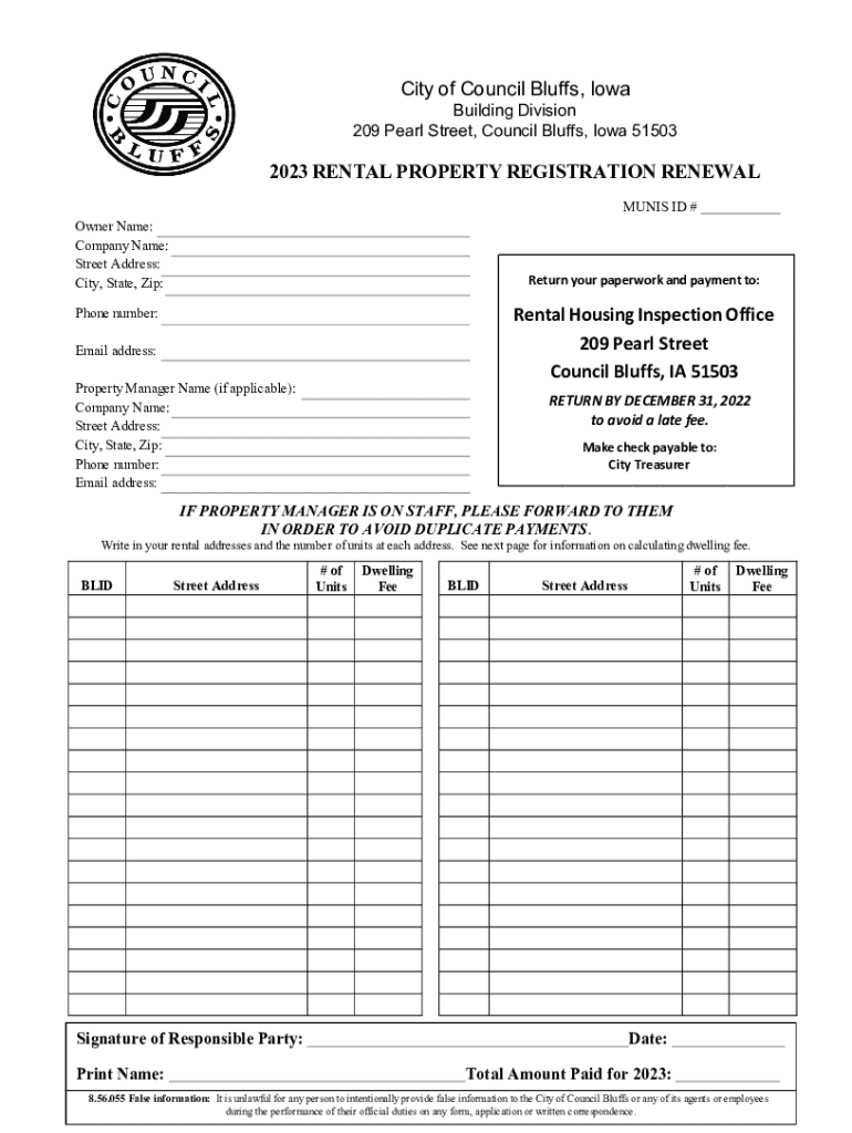 City of Council Bluffs, Iowa Building Division 209 Pearl Street, Council Bluffs, Iowa 515032023 RENTAL PROPERTY REGISTRATION RENEWAL TUNIS ID # Owner Name: Company Name: Street Address: City, State,
