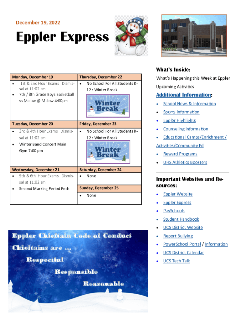 December 19, 2022Eppler Express What's Inside: Monday, December 19 1st & 2nd Hour Exams Dismissal at 11:02 am 7th / 8th Grade Boys Basketball vs Mallow @ Mallow 4:00pmThursday, December 22 No School