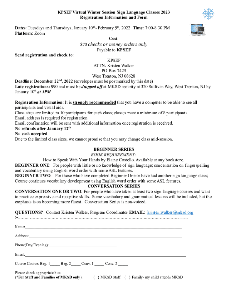 KP SEF Virtual Winter Session Sign Language Classes 2023 Registration Information and Form Dates: Tuesdays and Thursdays, January 10th February 9th, 2022 Time: 7:008:30 PM Platform: Zoom Cost: $70