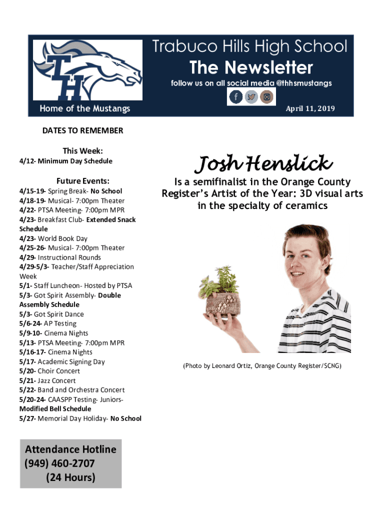 Traduce Hills High Schools Newsletter follow us on all social media @thhsmustangsHome of the Mustangs April 11, 2019DATES TO REMEMBER This Week: 4/12 Minimum Day ScheduleFuture Events: 4/1519 Spring