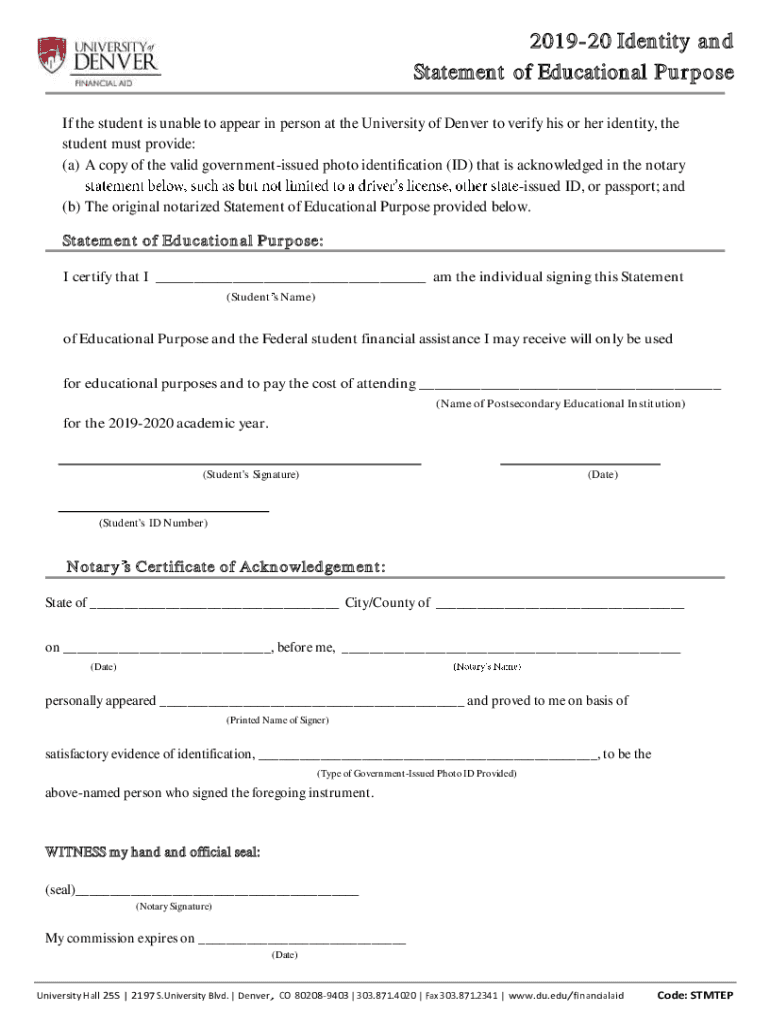 201920 Identity and Statement of Educational Purpose If the student is unable to appear in person at the University of Denver to verify his or her identity, the student must provide: (a) A copy of