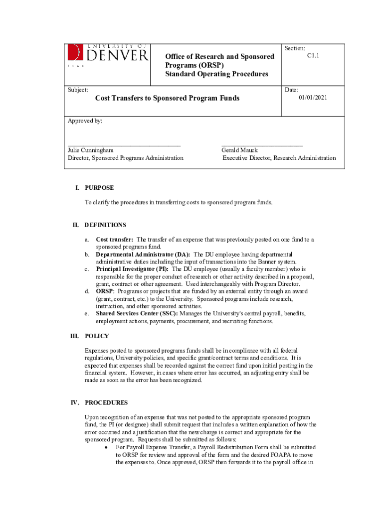 Office of Research and Sponsored Programs (ORP) Standard Operating Procedures Subject:Cost Transfers to Sponsored Program FundsSection:Date:C1.101/01/2021Approved by: ___ Julie Cunningham Director,