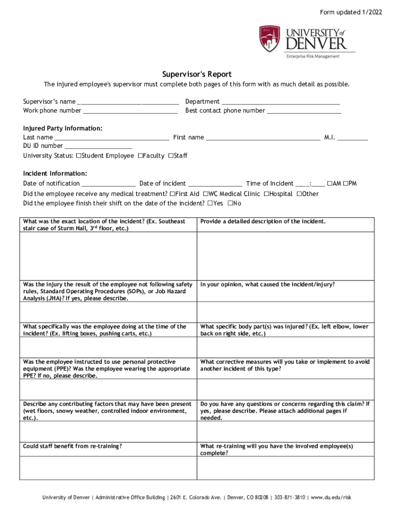 Form updated 1/2022Supervisor\'s Report The injured employee\'s supervisor must complete both pages of this form with as much detail as possible. Supervisors name ___ Work phone number ___Department