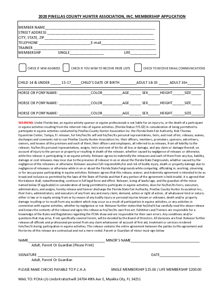 2020 PINELLAS COUNTY HUNTER ASSOCIATION, INC. MEMBERSHIP APPLICATION MEMBER NAME___ STREET ADDRESS ___ CITY, STATE, ZIP___ TELEPHONE ___Email___ TRAINER ___ MEMBERSHIP SINGLE___ LIFE___CHECK IF NEW