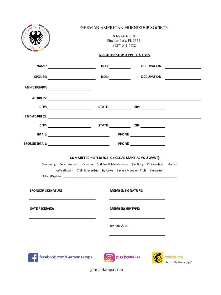 GERMAN AMERICAN FRIENDSHIP SOCIETY 8098 66th St N Pinellas Park, FL 33781 (727) 5416782 MEMBERSHIP APPLICATION NAME:0DOB:1/0/1900OCCUPATION: 0SPOUSE:0DOB:1/0/1900OCCUPATION: 0ANNIVERSARY:1/0/1900ADDRESS:0CITY:02ND