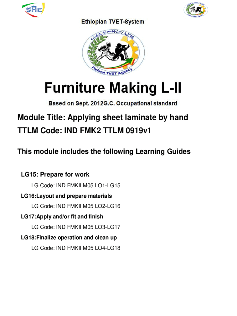 Module Title: Applying sheet laminate by hand TTL Code: IND FMK2 TTL 0919v1 This module includes the following Learning Guides LG15: Prepare for work LG Code: IND FAKIR M05 LO1LG15 LG16:Layout and