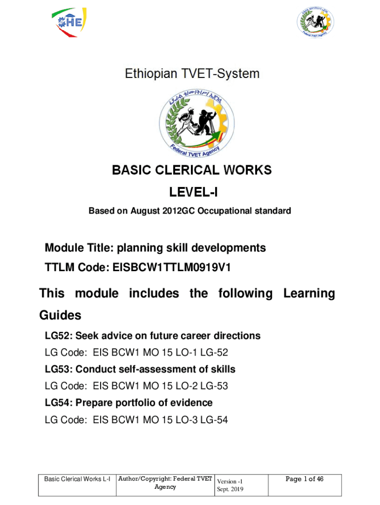 Based on August 2012GC Occupational standardModule Title: planning skill developments TTL Code: EISBCW1TTLM0919V1This module includes the following Learning Guides LG52: Seek advice on future career