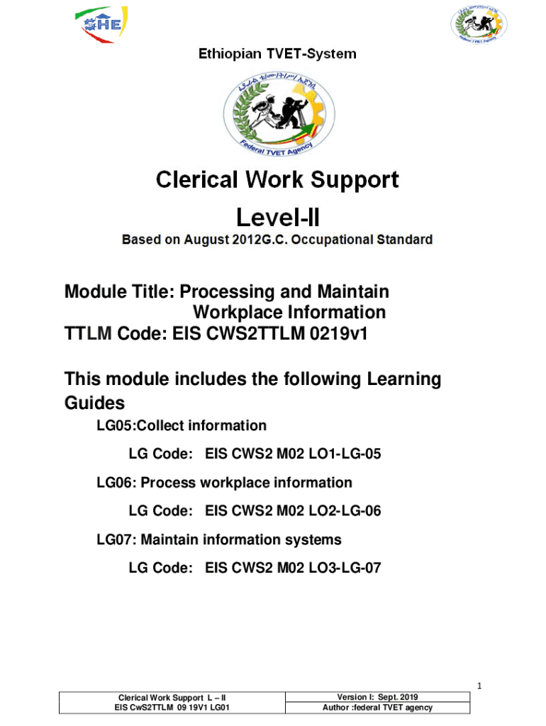 Module Title: Processing and Maintain Workplace Information TTL Code: EIS CWS2TTLM 0219v1 This module includes the following Learning Guides LG05:Collect information LG Code: EIS CWS2 M02 LO1LG05