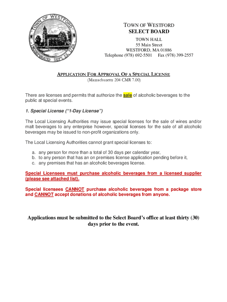 TOWN OF WESTWARD SELECT BOARD TOWN HALL 55 Main Street WESTWARD, MA 01886 Telephone (978) 6925501 Fax (978) 3992557APPLICATION FOR APPROVAL OF A SPECIAL LICENSE (Massachusetts 204 CMR 7.00)There are