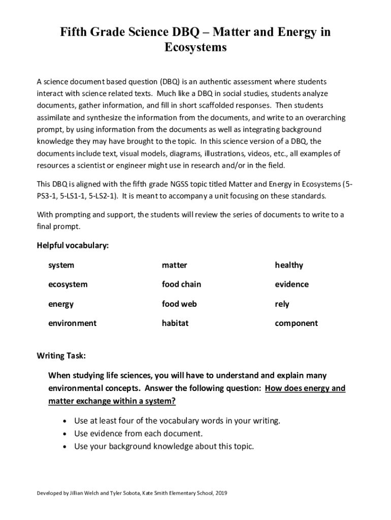 Fifth Grade Science DBQ Matter and Energy in Ecosystems A science document based question (DBQ) is an authentic assessment where students interact with science related texts. Much like a DBQ in social