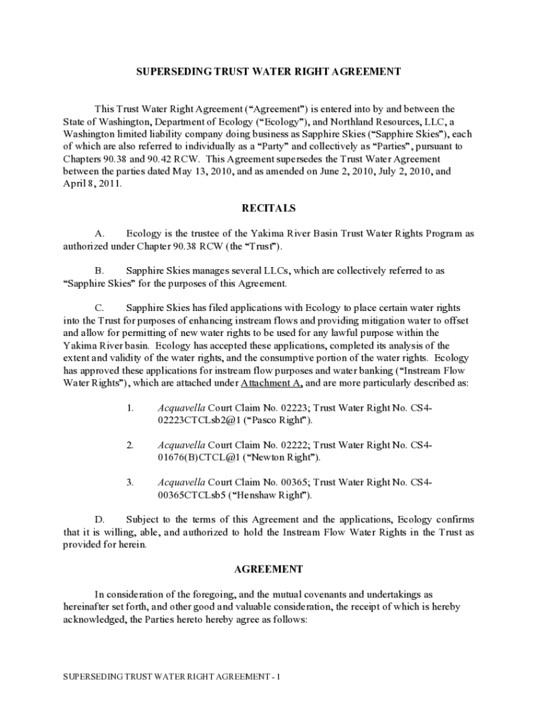 SUPERSEDING TRUST WATER RIGHT AGREEMENT This Trust Water Right Agreement (Agreement) is entered into by and between the State of Washington, Department of Ecology (Ecology), and Northland Resources,
