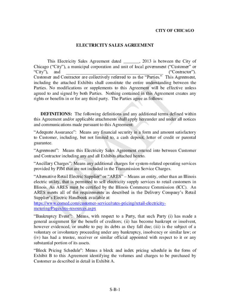 CITY OF CHICAGOELECTRICITY SALES Agreements Electricity Sales Agreement dated ___, 2013 is between the City of