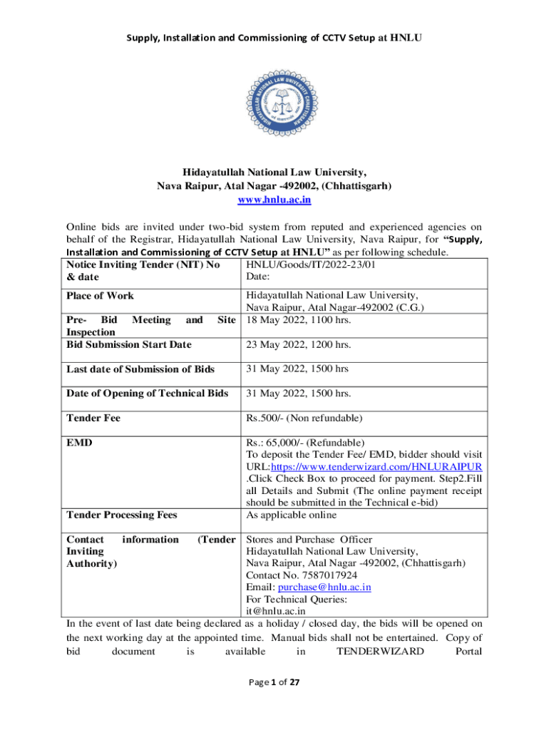 Supply, Installation and Commissioning of CCTV Setup at HNLUHidayatullah National Law University, Navy Raipur, Fatal Nagar 492002, (Chhattisgarh) www.hnlu.ac.in Online bids are invited under two bid